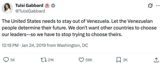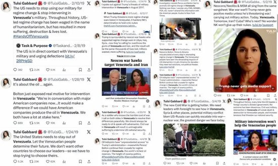 有美国网民还发现,当年准备竞选美国总统的加巴德,还在一段视频中“语重心长”地表示,美国应该终止充满破坏性且极为浪费钱的政权更迭战争,因为这种外部势力的干涉只会给别国带来更大的麻烦和苦难——“尤其是拉美国家”。
