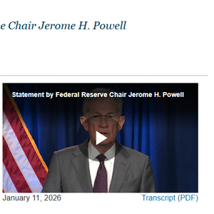 鲍威尔在视频中表示,“(上)周五,美国司法部向美联储发出了大陪审团传票,威胁要就我去年六月在参议院银行业委员会的证词提出刑事起诉。该证词部分涉及一项为期数年的美联储历史性办公大楼翻修项目。”
