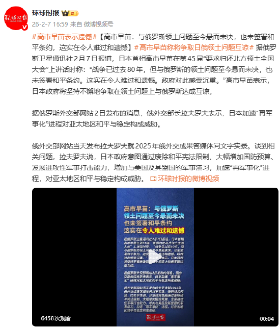 [高市早苗:与俄罗斯领土问题至今悬而未决,也未签署和平条约,这实在令人难过和遗憾]#高市早苗称将争取日俄领土问题互谅# 据俄罗斯卫星通讯社2月7日报道,日本首相高市早苗在第45届“要求归还北方领土全国大会”上讲话时称:“战争已过去80年,但与俄罗斯的领土问题至今悬而未决,也未签署和平条约。这实在令人难过和遗憾。政府对此感受沉重。”高市早苗表示,日本政府将坚持不懈地争取在领土问题上与俄罗斯达成互谅。