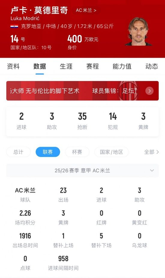 莫德里奇现年40岁,他本赛季为米兰出场26次,贡献2球3助。今晨的比赛中,莫德里奇为球队打入绝杀进球。
