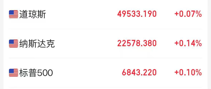 截至收盘,道琼斯指数涨0.07%,报49533.19点;标普500指数涨0.1%,报6843.22点;纳斯达克综合指数涨0.14%,报22578.38点。