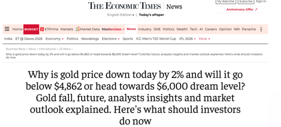 业内分析认为,在美联储降息预期有所降温的背景下,黄金在5000美元关口遭遇阻力,叠加部分投资者获利了结,加剧了价格下行压力。印度《经济时报》认为,未来黄金价格走势与美元走强、流动性下降、美联储前景以及地缘政治紧张局势缓解有关。投资者可以关注降息及5600美元附近的阻力位及未来价格走向。