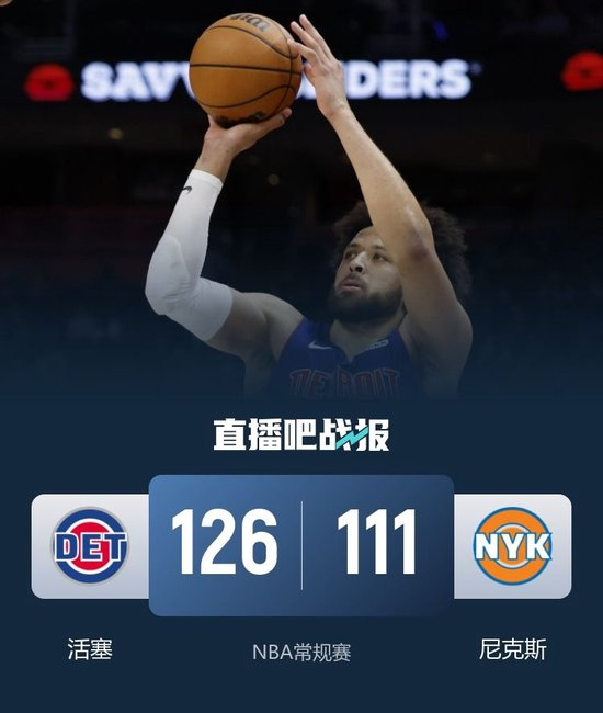 比赛开始,尼克斯打出9-2开局,活塞开局慢热后坎宁安里突外投连砍8分带队打出攻击波直接反超,尼克斯全民皆兵回应,首节活塞领先2分,次节双方展开拉锯战,活塞接连内线暴扣建立微弱领先,尼克斯外线始终不开,活塞7-0领先到10分。下半场,唐斯发力连砍8分带队一度追到差2分,邓罗连续三分回应,坎宁安保持火热状态带队重新拉开双位数领先,末节活塞多点开花继续扩大领先,尼克斯7-0止血但活塞牢牢保持双位数领先,最终活塞126-111力克尼克斯。
