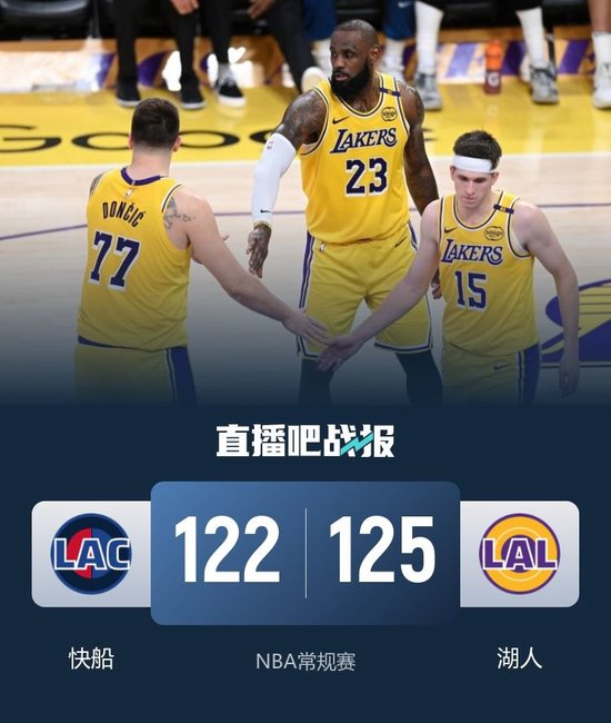 首节之争双方进攻端状态都非常不错,快船方面小卡首节虽然仅得两分但全队多点开花,不过湖人方面得手风更顺单节砍下41分并奠定首节11分得领先,东契奇一人独砍17分接管比赛;次节小卡站出来同样砍下19分并在进攻端稍胜一筹,不过湖人方面得“东詹里”三人合砍47分顶住压力并带着7分领先进入下半场,快船这边科林斯被海斯犯规脑袋着地导致下半场无法出战。第三节双方状态起起伏伏,快船在最多落后12分得情况下轰出一波23-9的攻势实现大逆转;这之后湖人虽然回暖但没能控制局势,双方在第四节多次互换领先将悬念留到最后,不过决胜时刻伦纳德因为脚踝伤势退出比赛,随后马瑟林也因六犯毕业,巴图姆最后错失绝平三分,湖人守住优势。最终,湖人主场力克快船拿下比赛。