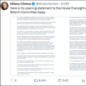 有趣的是,这场闭门会议在进行约一小时后,竟因一张现场照片的外泄而陷入中断。希拉里的发言人在X平台上发帖质问,称现场画面流传至社交平台属于“严重违规”,陈述程序也因此一度被迫停摆。好在风波很快平息,希拉里在不到一小时后便恢复了作证。