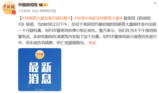 警方表示,他们在当天下午接到报警电话,此前特勤局在该建筑内发现了这个包裹。纽约市警察局表示调查仍在进行中,但未报告有疏散、伤亡或逮捕情况。