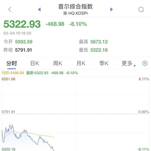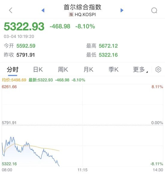3月4日,韩国市场持续走低,韩国综合股价指数暴跌8%,触发熔断机制。此外,韩国创业板指数KOSDAQ暴跌8%,同样触发熔断机制,交易暂停20分钟。