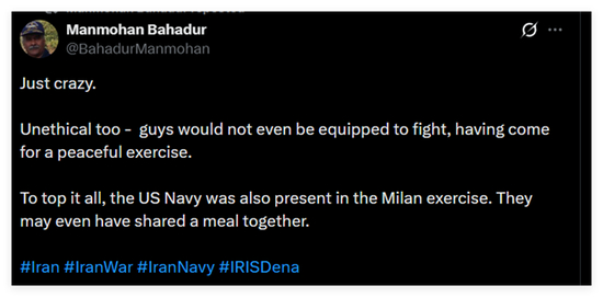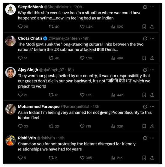 因此,当伊朗“德纳”号完成了在印度的活动,在返航途中遭到美军击沉后,不少印度网民都对美军杀害自己国家客人的做法感到愤怒,对印度没有保护好伊朗客人感到自责和内疚。这些帖文都获得了大量点赞。