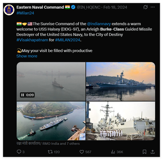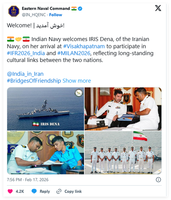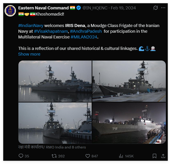 印度海军的官方账号还于今年2月活动期间,公开发帖对伊朗这艘军舰的到来表示热烈欢迎。