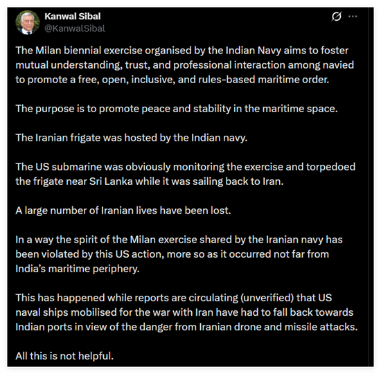 印度前外交秘书、资深外交官坎瓦尔・西巴尔在一则帖文中强调了印度“米兰”联合演习的意义,称这一活动的目的,是增进各国海军间的相互理解、信任与专业交流,演习目的是维护海洋空间的和平与稳定。他还认为,伊朗海军是秉持着这场军演的精神返航的。