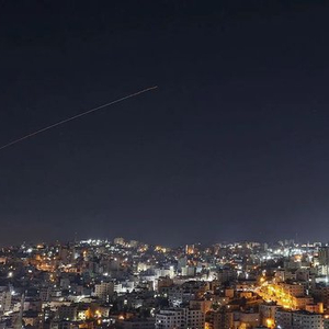 当地时间2026年3月4日,约旦河西岸希伯伦市,伊朗新一轮导弹袭击期间,城市上空可见火箭尾迹。图/视觉中国