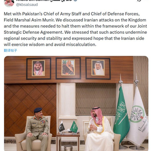 局势瞬间再度紧张起来。数小时后,巴基斯坦陆军元帅穆尼尔抵达利雅得,与沙特国防大臣萨勒曼举行会晤。萨勒曼随后在声明中强调,双方在巴沙共同防御协定框架下,讨论了伊朗对沙特的持续袭击,以及制止袭击的必要措施。