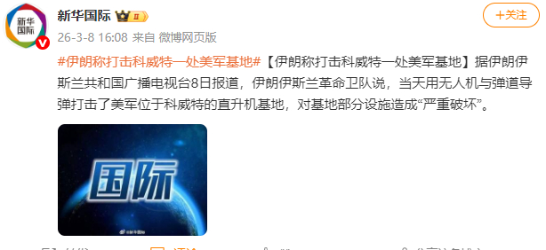 伊朗称打击科威特一处美军基地 新华国际 新华社国际新闻官方账号 03月08日16:08 关注 听新闻 [伊朗称打击科威特一处美军基地]据伊朗伊斯兰共和国广播电视台8日报道,伊朗伊斯兰革命卫队说,当天用无人机与弹道导弹打击了美军位于科威特的直升机基地,对基地部分设施造成“严重破坏”。