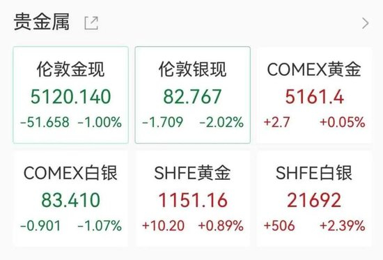 贵金属方面,现货黄金、现货白银下挫,截至发稿,现货黄金跌1%报5120.14美元/盎司,现货白银跌超2%报82.767美元/盎司。