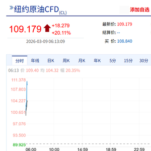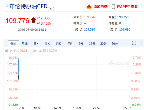 3月9日早盘,国际油价直线飙涨,WTI原油期货、布伦特原油期货突破110美元/桶。截至北京时间6:12,WTI原油期货最新报109.0美元/桶,日内上涨20.11%。布伦特原油期货最新报109.776美元/桶,日内上涨18.43%。