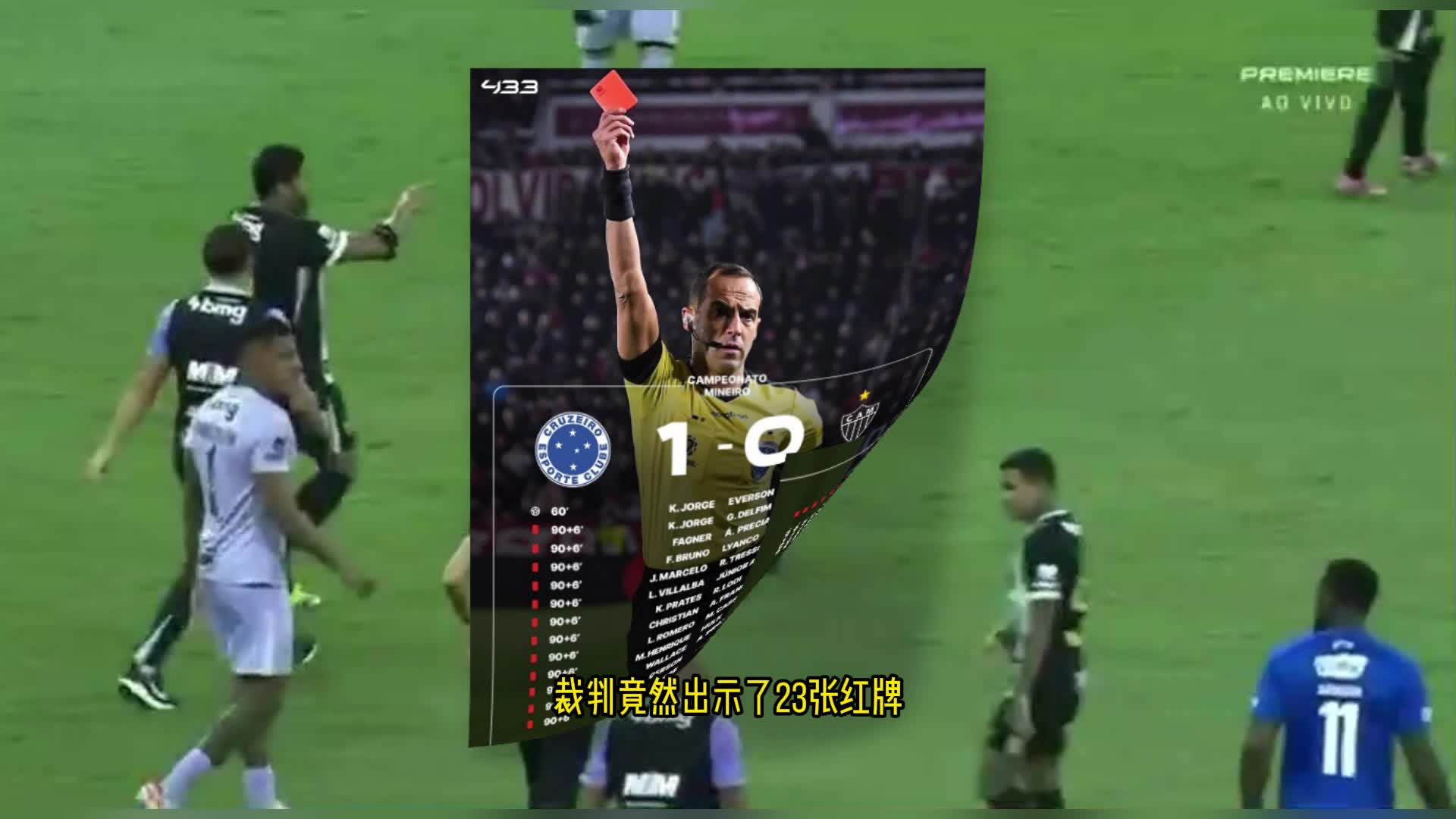 巴西米内罗州锦标赛决赛,克鲁塞罗1-0击败米内罗竞技。据巴西媒体报道,赛后裁判报告中显示,共计有23人吃到红牌,由于现场混乱未能当场出示红牌。