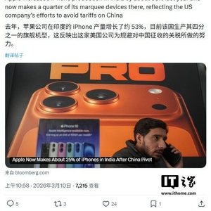从出口数据看,印度 iPhone 的离岸价值在 2025 财年达到 220 亿美元(现汇率约合 1521.94 亿元人民币),其中 175 亿美元(现汇率约合 1210.64 亿元人民币)为出口额。业内分析认为,这一增长有助于苹果规避 16% 的整机进口关税,提升在印度市场的价格竞争力。