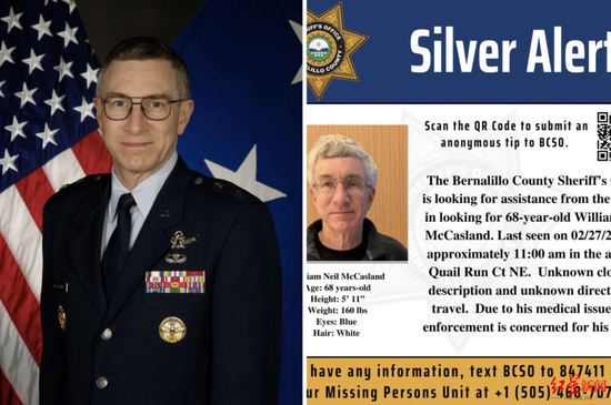当地执法部门表示,68岁的威廉·尼尔·麦卡斯兰德在离开位于美国新墨西哥州的住所后步行外出,随后失去踪迹,其手机仍留在家中。目前,其已失踪11天。