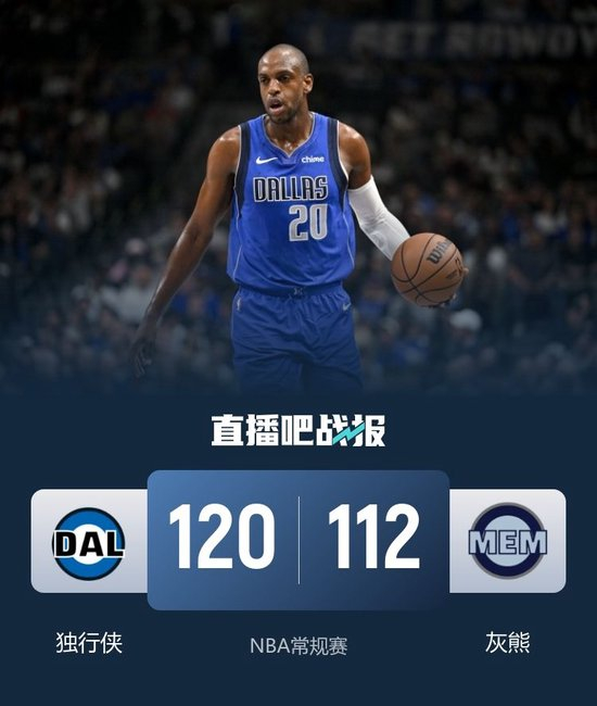 比赛开始,两队开场短暂相持,米德尔顿三分引领球队13-4的进攻高潮将分差拉开到两位数,灰熊连中三分努力追赶,次节双方围绕10分分差展开拉锯战,加福德高效终结,独行侠一度将分差拉开到20分,灰熊连投带罚止血,半场战罢独行侠65-54领先灰熊。易边再战,独行侠命中率下降,灰熊轮番冲击内线频频得手扳平比分,末节独行侠9-0重新占据场上主动,灰熊苦苦追赶无果,米德尔顿连中三分锁定胜局。最终,独行侠120-112击败灰熊,结束8连败的同时送给灰熊6连败。