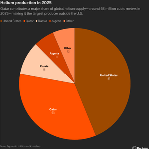 Kapadia表示,从卡塔尔采购氦气的工业气体公司,包括法国液化空气集团(Air Liquide)、林德集团(Linde)以及空气化工产品有限公司(Air Products and Chemicals),预计将是受此次供应冲击影响最大的几家公司。