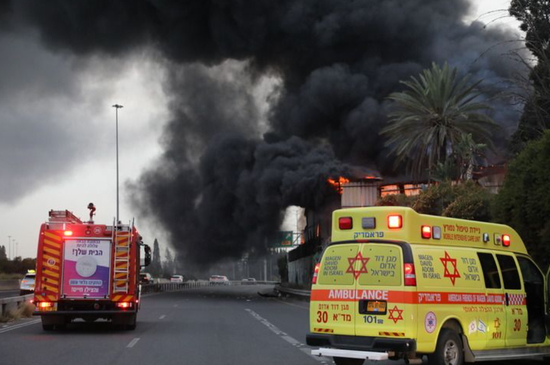 3月13日,在以色列中部城市霍隆,遭伊朗导弹袭击的一处地点冒出滚滚浓烟。图源:新华社