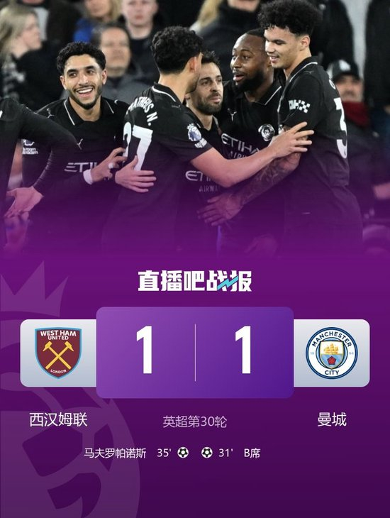 直播吧3月15日讯 北京时间3月15日凌晨4:00,2025-26赛季英超联赛第30轮,西汉姆联坐镇伦敦碗迎战曼城。上半场马尔穆什故意手球染黄,B席小角度挑射破门,随后多纳鲁马在角球防守中出击失误,马夫罗帕诺斯头球扳平,曼城暂1-1西汉姆联;下半场补时阶段格伊错失良机,最终曼城1-1战平西汉姆联,各项赛事近4战只收获1胜,联赛落后榜首9分。