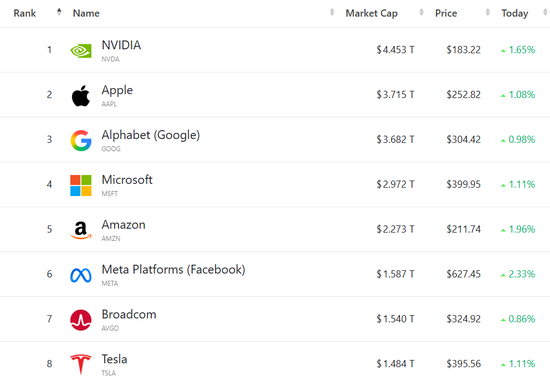 大型科技股集体走强,(按市值排列)苹果涨1.08%,谷歌C涨0.98%,微软涨1.11%,亚马逊涨1.96%,Meta涨2.33%,博通涨0.86%,特斯拉涨1.11%。