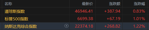 截至收盘,道琼斯指数涨0.83%,报46946.41点;标普500指数涨1.01%,报6699.38点,双双结束四连跌;纳斯达克综合指数涨1.22%,报22374.18点。