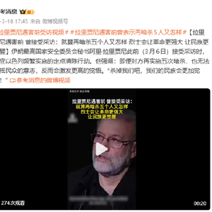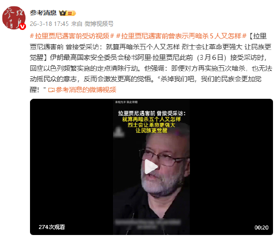 #拉里贾尼遇害前受访视频# #拉里贾尼遇害前曾表示再暗杀5人又怎样#[拉里贾尼遇害前 曾接受采访:就算再暗杀五个人又怎样 烈士会让革命更强大 让民族更觉醒]伊朗最高国家安全委员会秘书阿里·拉里贾尼此前(3月6日)接受采访时,回应以色列频繁实施的定点清除行动。他强调:即便对方再实施五次暗杀,也无法动摇民众的意志,反而会激发更高的觉悟。“杀掉我们吧,我们的民族会更加觉醒!”