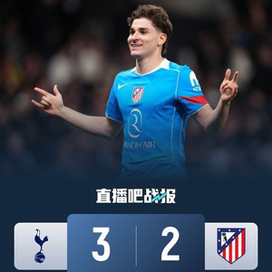 直播吧3月19日讯 北京时间3月19日4:00,欧冠1/8决赛次回合,热刺在新托特纳姆热刺球场迎战马德里竞技。上半场,卢克曼进球因越位被吹掉,穆阿尼头球破门打破僵局;下半场,卢克曼反击助攻阿尔瓦雷斯破门,哈维·西蒙斯回敬远射,汉茨科头球再度扳平比分,哈维·西蒙斯在比赛尾声阶段造点并主罚命中。最终热刺在主场以3-2击败马竞,但仍以总比分5-7被挡在欧冠八强之外。