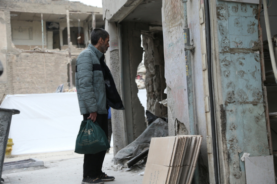 3月15日,在伊朗首都德黑兰的一处遇袭居民区,一名男子站在一座损毁建筑前 图: 新华社