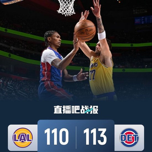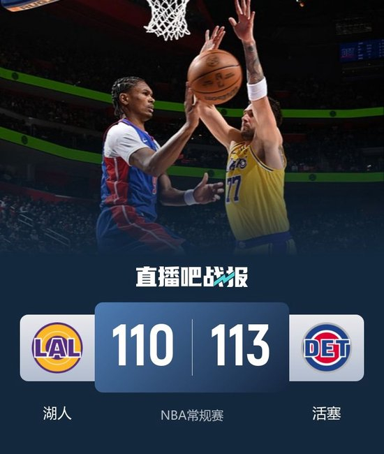 比赛上来,两队打得相当胶着,场上比分交替领先,詹姆斯和东契奇都有小受伤情况出现好在处理后无碍能继续打,但是次节活塞突然大爆发,他们攻势如潮单节狂轰42分,净胜17分后在半场结束时领先到13分;下半场回来,湖人状态回暖发起追分,第三节末段东契奇连拿五分直接抹平分差,末节在91-91平后活塞连拿六分稳住局势,不过湖人依旧紧咬比分,关键时刻里夫斯抛投反超,詹金斯撤步跳投还有,东契奇撤步中距离打铁后詹金斯再获两罚并全中,东契奇绝平三分不中,最终活塞险胜湖人,迎来四连胜的同时也终结了后者的九连胜。