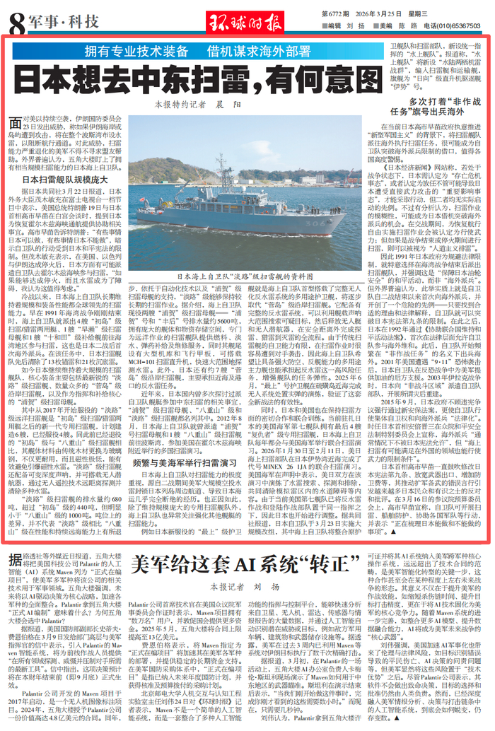 在当前日本高市早苗政府执意推进“新型军国主义”的背景下,将扫雷舰队派往海外执行扫雷任务,很可能成为自卫队突破海外派兵限制的借口,值得各国高度警惕。
