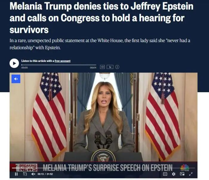 原标题:《美国第一夫人发声明:否认与爱泼斯坦及其罪行有任何关联》