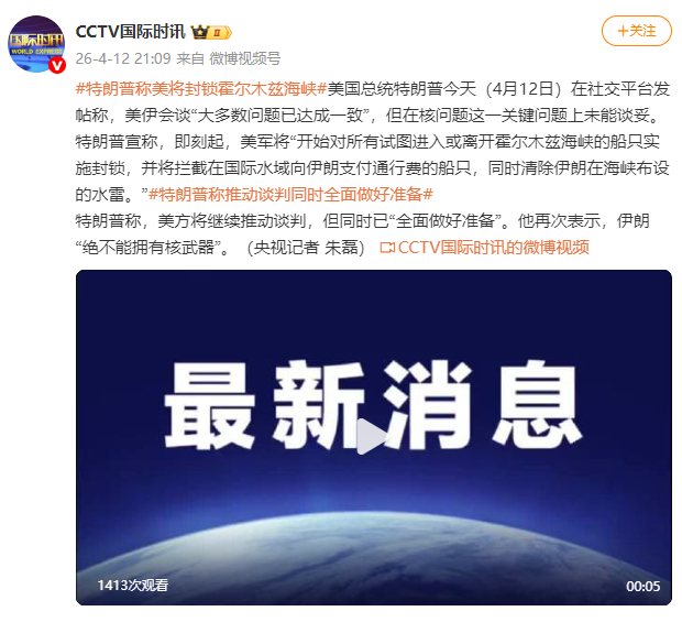[特朗普称美将封锁霍尔木兹海峡]美国总统特朗普今天(4月12日)在社交平台发帖称,美伊会谈“大多数问题已达成一致”,但在核问题这一关键问题上未能谈妥。特朗普宣称,即刻起,美军将“开始对所有试图进入或离开霍尔木兹海峡的船只实施封锁,并将拦截在国际水域向伊朗支付通行费的船只,同时清除伊朗在海峡布设的水雷。”