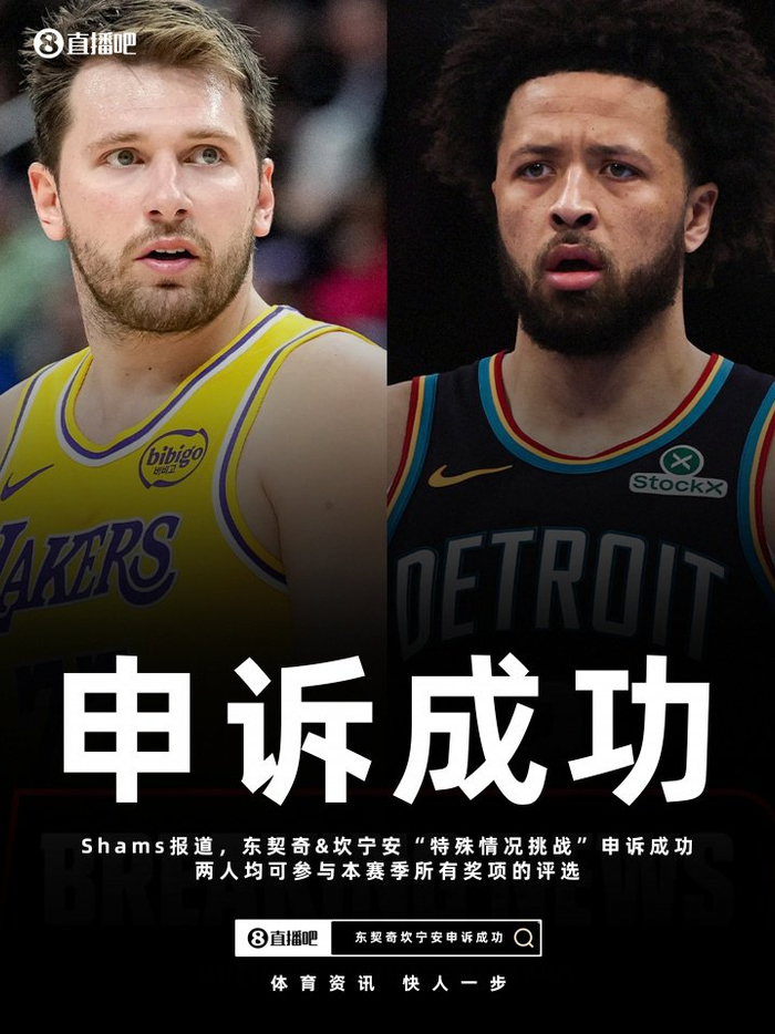 球员工会和联盟共同选出了“挑战委员会”,挑战委员会认为,东契奇的女儿出生(导致他缺席2场)、坎宁安的肺塌陷(导致他赛季末缺席大量比赛)属于特殊情况和非篮球相关的伤病,因此,判定两人的申诉为“通过”。