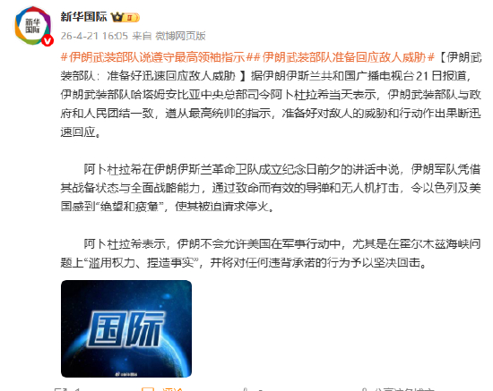 [伊朗武装部队:准备好迅速回应敌人威胁 ]据伊朗伊斯兰共和国广播电视台21日报道,伊朗武装部队哈塔姆安比亚中央总部司令阿卜杜拉希当天表示,伊朗武装部队与政府和人民团结一致,遵从最高统帅的指示,准备好对敌人的威胁和行动作出果断迅速回应。