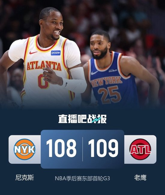 直播吧4月24日讯 NBA季后赛,老鹰回到主场迎战尼克斯。目前大比分双方战成1-1平。