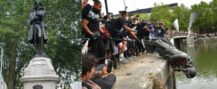 上周日,布里斯托的示威者将当地一名奴隶贩(slave trader)的雕像拽倒并扔进河中,引发了英国各地对城市雕像人物背景的关注。