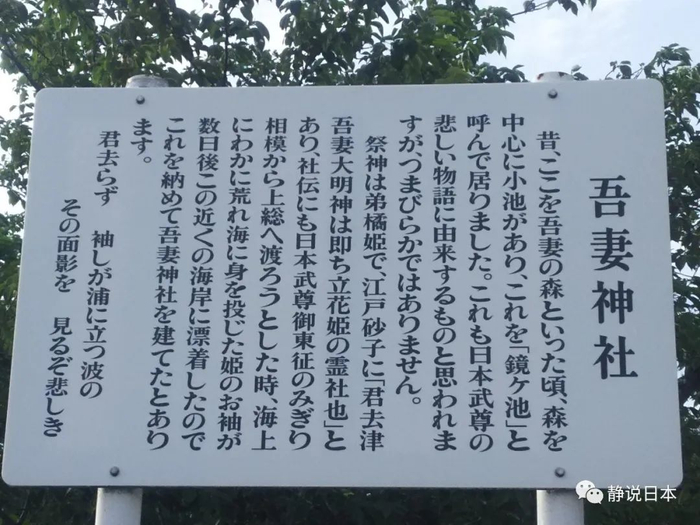 日本古代史籍《日本书记》记述说,为了镇住发怒的海神,日本武尊的妻子弟橘姫愤然跳海,于是日本武尊天天在海边高喊“吾嬬(妻)者耶”(我老婆幺)。日本武尊喊话的地方,就叫“吾妻”。