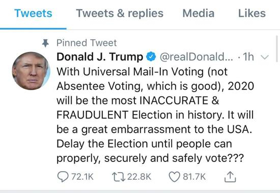 特朗普就曾发推声称2020年竞选投票方式存在缺陷,借机建议推迟选举。