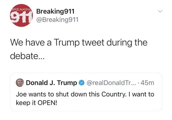 特朗普打断原本拜登的回答:“拜登只是想关闭这个国家,我只是想让美国保持运作,我要打断他一下下。