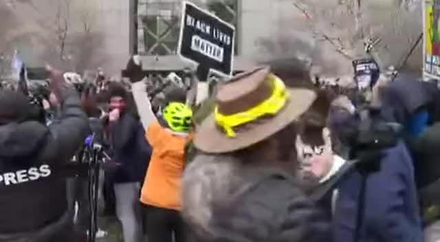 听到弗洛伊德案白人警察宣判有罪 法庭外人群爆发欢呼尖叫