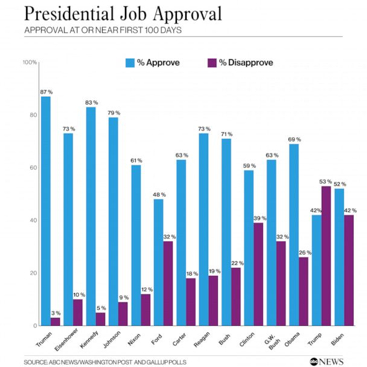 如同其承诺的一样,拜登在这一百天内,将疫情和危机控制作为首要任务,其成绩单目前表现还不错。ABC和华盛顿邮报的民意调查显示,民众对拜登100天内的满意度达到52%,对其应对疫情和经济刺激法案的支持度分别高达64%和65%,其中还包括了不少共和党人,在美国严重政治分裂的当下,这已是不错的比例。相比之下,特朗普上任100天时,对其不满意的民众有53%,和拜登的比例正好调了个头。