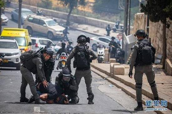 (图片说明:5月10日,在耶路撒冷老城圣殿山(穆斯林称“尊贵禁地”)附近,以色列警察逮捕一名巴勒斯坦示威者。新华社/基尼图片社)