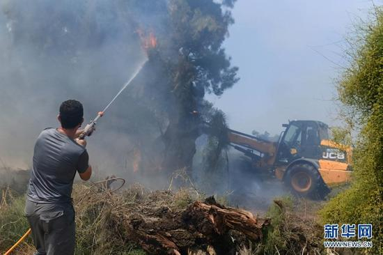 (图片说明:5月11日,在以色列南部城市阿什凯隆附近,一名男子试图扑灭因加沙地带火箭弹袭击引发的火灾。新华社/基尼图片社)