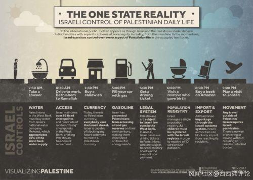 巴勒斯坦人必须从以方购买水,以色列在西岸领土上拥有数百个检查点,可以随时检查,巴勒斯坦没有自己的货币,没有汽油和能源供应,执行的法律是以色列法律,人口登记由以色列进行,所有的进出口通过以色列海关,巴勒斯坦人出入境必须得到以色列的允许。