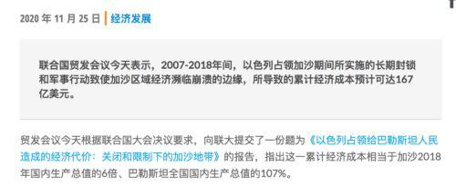 根据联合国贸发会议的一份报告,以色列对加沙实施的长期封锁带来的经济成本是167亿美元,是加沙2018年GDP的6倍。