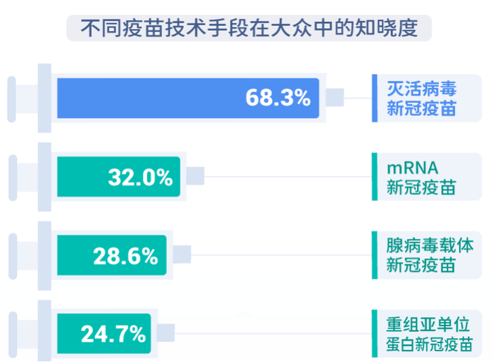 根据《新冠疫苗认知调查报告》,在大众中知名度最高的当属灭活疫苗,有68.3%的人知道这种疫苗;mRNA疫苗知晓度居次位,有32.0%;再次是腺病毒载体疫苗、重组亚单位蛋白疫苗,分别有28.6%和24.7%,此外,还有20.5%的人对这四种疫苗都不了解。继续深入疫苗科普,还是非常有必要的。