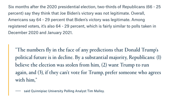 昆尼皮亚克大学26号公布的最新民调显示,高达66%的共和党人希望特朗普2024重振旗鼓,只有25%的共和党人反对特朗普再次参选。而且,大部分共和党人都认同特朗普的说法,即2020年总统大选存在欺诈。